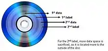 If you add a label on the data side of the disc, then this space is no longer available for data. The amount of space it takes depends on the size (width) of the label and the location of the label on the disc. The wider the label and the more it is located on the outside of the disc, the more space it takes. In other words: the bigger the label, the more disc surface is occupied and thus the more data-space you sacrifice. For example: a 5 mm label at the inside requires 10% capacity, and at the outside of the disc about 20% of the disc capacity.