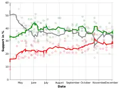 Since the end of 2021, Labour consistently polled ahead of the Conservatives as the governments under prime ministers Boris Johnson, Liz Truss, and Rishi Sunak were affected by issues such as the cost of living crisis, the July 2022 government crisis, the September 2022 mini-budget, the October 2022 government crisis, and the industrial disputes.[141][142] By mid-October 2022, Labour were recording polling leads such as 36% against the Conservatives according to Redfield & Wilton.[143]