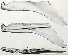 Creosaurus, Epanterias, and Labrosaurus are regarded as junior synonyms of Allosaurus.[44] Most of the species that are regarded as synonyms of A. fragilis, or that were misassigned to the genus, are obscure and based on very scrappy remains. One exception is Labrosaurus ferox, named in 1884 by Marsh for an oddly formed partial lower jaw, with a prominent gap in the tooth row at the tip of the jaw, and a rear section greatly expanded and turned down.[55] Later researchers suggested that the bone was pathologic, showing an injury to the living animal,[17] and that part of the unusual form of the rear of the bone was due to plaster reconstruction.[56] It is now regarded as an example of A. fragilis.[44]