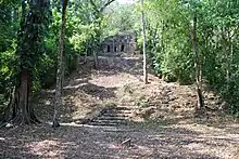 Yaxchilan flourished in the 8th and 9th centuries. The site contains extensive ruins, with palaces and temples bordering a large plaza upon a terrace above the Usumacinta River. The architectural remains extend across the higher terraces and the hills to the south of the river, overlooking both the river itself and the lowlands beyond.[14] Yaxchilan is known for the large quantity of excellent sculpture at the site, such as the monolithic carved stelae and the narrative stone reliefs carved on lintels spanning the temple doorways.[14][15] Over 120 inscriptions have been identified on the various monuments from the site.[16] The major groups are the Central Acropolis, the West Acropolis and the South Acropolis. The South Acropolis occupies the highest part of the site.[16] The site is aligned with relation to the Usumacinta River, at times causing unconventional orientation of the major structures, such as the two ballcourts.[17] The site is relatively natural with howling monkeys, bats, toucans and other wildlife to be seen in and around the buildings.[6]