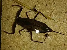 Water scorpions are a carnivorous ambush predator, hunting on the edges of shallow creeks or pools.[2] They wait for prey to come within reach of their pincer-like forelegs, where they can grasp unsuspecting aquatic prey.[2] Once the prey has been caught the water scorpion inserts its rostrum into the body of the victim and injects enzymes that liquify the insides.[2] Finally, it consumes the liquified insides through its rostrum. Water scorpions feed on a variety of aquatic animals, such as tadpoles, small fish, and mosquito larvae.[3]