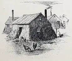 The term "shanty" is suggested as deriving from the Irish noun seanteach (lit. "old house" - pronounced shan-tchawk).[1] though it is closer to the plural noun "old houses", Seantithe, pronounced shan-tiha. However the direct back translation of shan-ty would arrive at sean tí, the latter word an adjective meaning 'of the house' much in the vein of Bean an tí, ban-on-tee, means the matriarch of the house. Many poor Irish tenant farmers lived in one-room cabins. "The Irishman's Shanty", a 19th-century comic song, describes a stereotypical Irishman's quarters:[6]