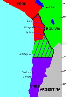 The conflict is also known as the "Saltpeter War", the "Ten Cents War" (in reference to the controversial ten-centavo tax imposed by the Bolivian government), and the "Second Pacific War".[10] It is not to be confused with the pre-Columbian Saltpeter War, in what is now Mexico, nor the "Guano War" as the Chincha Islands War is sometimes named.[11] The war largely settled (or set up, depending on one's point of view) the "Tacna-Arica dispute", and is sometimes known by that name as well, although the details took decades to resolve.