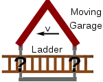 The simplest version of the problem involves a garage, with a front and back door which are open, and a ladder which, when at rest with respect to the garage, is too long to fit inside. We now move the ladder at a high horizontal velocity through the stationary garage. Because of its high velocity, the ladder undergoes the relativistic effect of length contraction, and becomes significantly shorter. As a result, as the ladder passes through the garage, it is, for a time, completely contained inside it. We could, if we liked, simultaneously close both doors for a brief time, to demonstrate that the ladder fits.