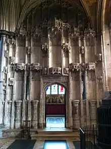 Bentham and Essex were both enthusiastic proponents of a longstanding plan to relocate the 14th-century choir stalls from under the octagon. With the octagon and east roof dealt with, the scheme was embarked on in 1769, with Bentham, still only a minor canon, appointed as clerk of works.[71] By moving the choir stalls to the far east end of the cathedral, the octagon became a spacious public area for the first time, with vistas to east and west and views of the octagon vaulting.[73] They also removed the Romanesque pulpitum and put in a new choir screen two bays east of the octagon, surmounted by the 1690s organ case.[72] Despite their antiquarian interests, Bentham and Essex appear to have dismantled the choir stalls with alarming lack of care, and saw no problem in clearing away features at the east end, and removing the pulpitum and medieval walls surrounding the choir stalls. The north wall turned out to incorporate the bones of seven 'Saxon worthies' which would have featured on the pilgrim route into the pre-Reformation cathedral.[74] The bones were rehoused in Bishop West's Chapel.[72] The choir stalls, with their misericords were however retained, and the restoration as a whole was relatively sympathetic by the standards of the period.