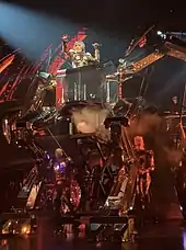 The Enigma show involves a loose storyline about "healing and finding yourself", with a setting aiming to emulate a post-apocalyptic punk environment.[12][17] A script was written by Gaga, with photographer Eli Russel largely contributing to the creative part of the show, as well.[12] Billboard's Andreas Hale found the narrative "part Wizard of Oz and part Ghost in the Shell."[18] Gaga wanted to integrate all her past hits into the show, while also giving it "a new feel for her interpretation of a Vegas show."[12][17] The gig involves a character named Enigma, brought to life through motion capture by Gaga. Enigma was based on a character that was used during Gaga's promotional rollout for her 2013 album, Artpop, called Petga.[12] In a video posted on her social media by before the residency kicked off, Gaga referred to Enigma as her alter ego.[19] Production designer LeRoy Bennett described the show as "a journey about Gaga and her Enigma character finding themselves within each other", therefore taking place "in various settings as she's going into her virtual world and her past. But it’s also the present and future, so it has to take on multiple personalities." Floating above the stage was a large light pod, which he called the "main lighting instrument" that could be interpreted as a spaceship or a cloud, or "energy beaming down on the stage to heal" Gaga.[12][17]
