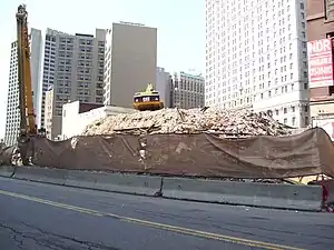 Demolition started on October 12, 2009. Demolition proceeded slowly throughout November and December 2009 and January 2010. On February 24, 2010, at 4:30 AM EST, the east tower of the 14-story portion of the building was leveled to the ground when it twisted towards the north and then collapsed resulting in smoke blanketing the surrounding block. The only remaining portion of the building is a pile of rubble.