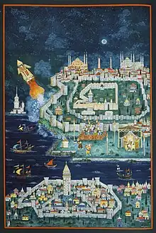 ![]() Lagâri Hasan Çelebi's rocket flight depicted in a 17th-century engraving | |