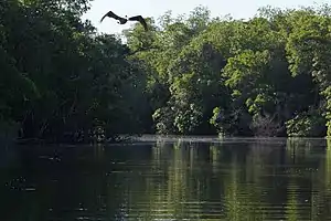 The Laguna de Manialtepec is a coastal lagoon about 18 km west of Puerto Escondido in the State of Oaxaca, Mexico. The name comes from Náhuatl “manial” (spring) and “tepec” (Hill), meaning (Hill where water is born).[1] Access to the lagoon by car is via Federal Highway 200 or by boat from Puerto Escondido. The lagoon is 15 km long with patches of leafy jungle and mangroves that reach 15 meters of height in some places .[2] The lagoon opens to the sea during the rainy season at a place known as Puerto Suelo or El Carnero.[3]