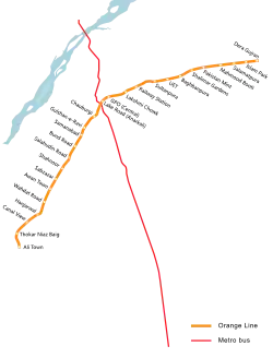 Lahore Metro is an automated rapid transit system in Lahore, Punjab, Pakistan and the first driverless metro in Pakistan. Three metro lines have been proposed, of which the Orange Line is operational. It is also Pakistan's first metro line system.