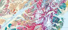 The park includes a variety of unrelated rocks. The core of the Chigmit Mountains is a granite pluton forced upwards[14] by the collision of the Pacific plate and the North American plate. Rocks in coastal areas are sedimentary in origin, and contain abundant fossils.[15] Volcanic rocks intrude through these native rocks.