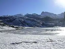 Lake Ercina is a small highland lake in Asturias, Spain. It is located in the Picos de Europa, in the Cantabrian Mountains. Situated next to Lake Enol, together, they forms the group known as Lakes of Covadonga within the Picos de Europa National Park. Lake Ercina is smaller than Lake Enol. It is situated at an altitude of 1,108 metres (3,635 ft) and its maximum depth is just over 2 metres (6 ft 7 in). The eutrophic lake covers approximately 8 hectares (20 acres).[1] Its characteristics are tied to its glacier origin and geographic location.