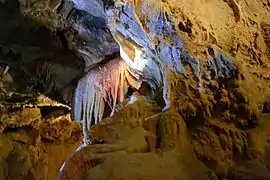 The caverns are dated to at least 200 million years, and were formed by flowing water. Over the years this water drained leaving the caverns seen today. The caves are made entirely of limestone and feature a wide variety of formations, including stalactites, stalagmites, soda straws, columns, and flowstone. The Discovery Room, one of eight known rooms in the cavern system, contains all types of limestone rock formation. The first recorded explorer was James A. Richardson, a federal fisheries employee. His claim of discovery is still clearly legible on the wall where he wrote it that day – November 11, 1878 – with carbide from his miner's lamp.