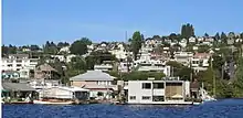 Floating homes line the east and west sides of Lake Union. In Sleepless in Seattle, the character played by Tom Hanks lived on one of these homes.[8]
