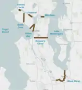 Proposed canal routes included the Black River, Semple's Canal across Beacon Hill, two possible routes from Lake Union to Elliott Bay via Lower Queen Anne and Belltown, the Montlake Cut, and Salmon Bay to Smith Cove via Interbay.