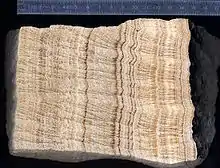 In geology, lamination (from Latin lāmina 'thin layer') is a small-scale sequence of fine layers (pl.: laminae; SG: lamina) that occurs in sedimentary rocks. Laminae are normally smaller and less pronounced than bedding. Lamination is often regarded as planar structures one centimetre or less in thickness, whereas bedding layers are greater than one centimetre.[1] However, structures from several millimetres to many centimetres have been described as laminae.[2] A single sedimentary rock can have both laminae and beds.