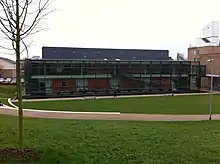 In the south-west corner sits the library designed in 1964 by Tom Mellor and Partners, the first phase opening in September 1966, the second in July 1968 and the third in January 1971.[20] The library was extended in 1997 and underwent a phased refurbishment in 2014, which was completed in 2016. In 2021 the Library Extension Project[21] was completed, which introduced additional student study space and 'living walls', exhibition and research space, a 'safepod'[22] and digital studio.