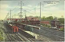 The legislature revised its plan to include the failed attempt with a connection from the canal terminus in Columbia to Philadelphia. Engineers recommended that a rail route—the Philadelphia and Columbia Railroad—be constructed with an inclined plane at either end.[18] The original route of the railroad was to pass north of Lancaster, but the city petitioned the state to alter it so that the railroad passed through downtown Lancaster.[19] The Philadelphia and Columbia Railroad opened in 1834, originally with a horse-drawn passenger cars before steam locomotives replaced them as motive power.[20] There are no photographs of the early Lancaster station, however the station would have most likely consisted of nothing more than an open-air, elevated platform, as was customary for train stations of that period.[21] The station was located at North Queen and East Chestnut Street, with the platform possibly extending the length of the lot between Queen and Christian Streets.[21]