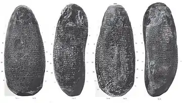 {{cite book}}: CS1 maint: location missing publisher (link) and pl. 9–10: translation and photographs - W. J. Hinke (1911). Selected Babylonian Kudurru Inscriptions. E. J. Brill. pp. 14–18. line art
