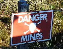 Argentinian forces invaded the Falkland Islands, a British overseas territory located in the South Atlantic, in April 1982. British forces retook the islands by 14 June in the Falklands War.[1] One of the first actions taken by the Argentinians after the invasion was to lay mine fields to assist in the defence of the islands.[2] Despite rumours that land mines were scattered randomly by helicopter, the majority of the mine fields seem to have been laid in a professional manner and the locations of individual mines recorded.[3] Approximately 30,000 land mines – of which there were at least 20,000 anti-personnel mines and 5,000 anti-tank devices – were laid in 146 separate mine fields.[3][4] The mine fields were focused around Stanley and Goose Green on East Falkland and Port Howard and Fox Bay on West Falkland.[5]