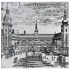 The castle-like building does not conform to any classical rule of architecture, for the portal is not placed centrally on the west side, nor is the entrance to the coat of arms hall, and the towers are differently designed. Moreover, the arcades of the staircases "butt up" against the tower walls. But this seems to be precisely the building's special charm, which is why Wilhelm Pinder called the Landhaus one of the proudest post-medieval urban buildings in the German-speaking world.