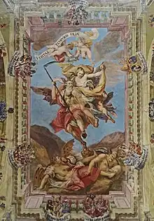 On the ceiling is a fresco by Fromiller. The ceiling mirror is framed by an "excellently constructed mock architecture in terms of perspective". The all-around portico with niches in the corners represents. In the niches are Grisailla statues of the Habsburg rulers Matthias, Ferdinand II, III, and IV. The cardinal virtues are depicted in balustrades in the center of each side. No sky opens above the mock architecture, but the hereditary homage of Emperor Charles VI is depicted. This had taken place on 22 August 1728 in the then Palais Rosenberg, now the town hall of Klagenfurt. However, Fromiller architecturally relocated it to the Great Hall of Heraldry. The emperor sits under a red canopy and is surrounded by the deputies, the ecclesiastical dignitaries, the duke's farmer, and the holders of the eleven provincial offices. The coats of arms of the latter as well as the coats of arms of Austria, Carinthia, and the ecclesiastical territories of Salzburg and Bamberg at the edge of the picture connect the homage scene with the mock architecture.