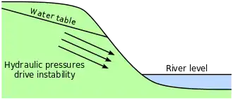 Rapid changes in the groundwater level along a slope can also trigger landslides. This is often the case where a slope is adjacent to a water body or a river. When the water level adjacent to the slope falls rapidly the groundwater level frequently cannot dissipate quickly enough, leaving an artificially high water table. This subjects the slope to higher than normal shear stresses, leading to potential instability. This is probably the most important mechanism by which river bank materials fail, being significant after a flood as the river level is declining (i.e. on the falling limb of the hydrograph) as shown in the following figures.