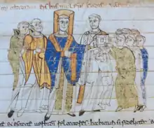 Landulf is well known for overseeing the production of several liturgical rotulae (scrolls) in Beneventan script now kept in the Biblioteca Casanatense in Rome. These were probably produced at the monastery of Santa Sofia. One of these, the benedictional Casanatense 724, ends with the words "I am Bishop Landulf's" (LANDOLFI EPISCOPI SUM) in gold capital block letters.[5] It contains twelve illustrations of the archbishop giving ordinations and benedictions.[6] The Exultet roll Vaticana lat. 9820 is a copy of one originally made for Landulf.[5]