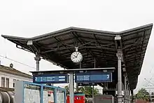 Langen (Hess) station is in the town of Langen in the German state of Hesse. It was opened in 1846 with the Main-Neckar Railway and is now served by the Rhine-Main S-Bahn. The station has two side platforms, an island platform and a through track without a platform. The station building and platform canopies are protected as monuments.[4] It is classified by Deutsche Bahn as a category 4 station.[1]
