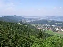 View from the Albis range looking over Langnau am Albis and several other tightly packed villages in the Sihl Valley