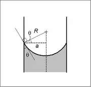 In a sufficiently narrow (i.e., low Bond number) tube of circular cross-section (radius a), the interface between two fluids forms a meniscus that is a portion of the surface of a sphere with radius R. The pressure jump across this surface is related to the radius and the surface tension γ by