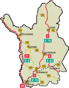 Three European roads pass through Lapland: E8, E63 and E75, the latter of which runs almost 600 kilometres from the southernmost municipality of Simo to the northernmost municipality of Utsjoki.[36]