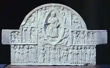 The sculpture was found in the 1870s when foundations were being excavated for a house at Larnaca.[1] Subsequently, it was acquired by Alessandro Palma di Cesnola, and given to his father-in-law, Edwin Henry Lawrence, in lieu of his financial support of Cesnola's collections.[2] On 27 April 1892, Augustus Pitt Rivers purchased the sculpture at auction and transferred it to his private museum in Dorset.[3] Most of the collection was moved to Oxford to found the Pitt Rivers Museum. The tympanum, however, remained in Dorset and was sold in the 1980s to the V&A. After the sculpture was acquired by the V&A, it was published in a catalogue by Paul Williamson, one time Keeper of Sculpture, Director of Collections and Acting Deputy Director of that museum.[4] The sculpture is currently on public exhibition in the medieval galleries at the V&A.
