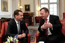 Lars Løkke Rasmussen RSKmd (Danish: [ˈlɑːs ˈløkə ˈʁɑsmusn̩] ⓘ; born 15 May 1964) is a Danish politician who has served as Minister of Foreign Affairs since 2022. He previously served as the 25th Prime Minister of Denmark from 2009 to 2011 and again from 2015 to 2019. He was the leader of the liberal Venstre party from 2009 to 2019.