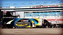 In 2006, plans were announced to reconfigure the track after the Nextel Cup Series race held in March, increasing the banking from the original 12 degrees to 20 degrees.[1] This reconfiguration entailed "progressive banking" which increases the degree of banking on a gradient towards the outside of the track. This increased side-by-side racing. The speedway also constructed a fan zone called the "Neon Garage". This area has live entertainment, unprecedented access to the drivers and teams, such as viewing areas for fans to watch their favorite driver's car get worked on and talk to the drivers, and is home to the Winner's Circle. The speedway moved pit road 275 feet (84 m) closer to the grandstands, built a new media center and added a quarter-mile oval for Legends Cars, Bandoleros, and Thunder Roadsters, in the tri-oval area.