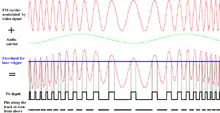 A standard home video LaserDisc is 12 in (30 cm) in diameter and made up of two single-sided aluminum discs layered in plastic. Although similar in appearance to compact discs or DVDs, early LaserDiscs used analog video stored in the composite domain (having a video bandwidth and resolution approximately equivalent to the 1-inch (25 mm) Type C videotape format) with analog frequency modulation (FM) stereo sound and pulse-code modulation (PCM) digital audio. Later discs used D-2 instead of Type C videotape for mastering. The LaserDisc at its most fundamental level was still recorded as a series of pits and lands much like CDs, DVDs, and even Blu-ray Discs are today. In true digital media the pits, or their edges, directly represent 1s and 0s of a binary digital information stream. On a LaserDisc, the information is encoded as analog frequency modulation and is contained in the lengths and spacing of the pits. A carrier frequency is modulated by the baseband video signal (and analog soundtracks). In a simplified view, positive parts of this variable frequency signal can produce lands and negative parts can be pits, which results in a projection of the FM signal along the track on the disc. When reading, the FM carrier can be reconstructed from the succession of pit edges, and demodulated to extract the original video signal (in practice, selection between pit and land parts uses intersection of the FM carrier with a horizontal line having an offset from the zero axis, for noise considerations). If PCM sound is present, its waveform, considered as an analog signal, can be added to the FM carrier, which modulates the width of the intersection with the horizontal threshold. As a result, space between pit centers essentially represent video (as frequency), and pits' lengths code for PCM sound information.[22] Early LaserDiscs featured in 1978 were entirely analog but the format evolved to incorporate digital stereo sound in CD format (sometimes with a TOSlink or coax output to feed an external digital-to-analog converter or DAC), and later multi-channel formats such as Dolby Digital and DTS.