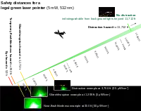 The graphic (right) illustrates laser safety concepts.[12] For example, it shows that the areas of most concern—eye damage, flash blindness and glare—occur relatively close to the aircraft. The distraction risk covers the longest hazard distance, but also presents the least concern. The photos in the graphic also give an idea of what the visual effect looks like to the pilot, at various distances. While the distances given are exact, the laser's brightness is in fact falling off slowly and so effects diminish continuously with increasing distance.