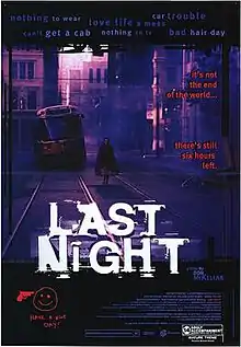 Last Night is a 1998 Canadian apocalyptic black comedy-drama film directed by Don McKellar and starring McKellar, Sandra Oh and Callum Keith Rennie. It was produced as part of the French film project 2000, Seen By.... McKellar wrote the screenplay about how ordinary people would react to an unstated imminent global catastrophic event. Set in Toronto, Ontario, the film was made and released when many were concerned about the Year 2000 problem.
