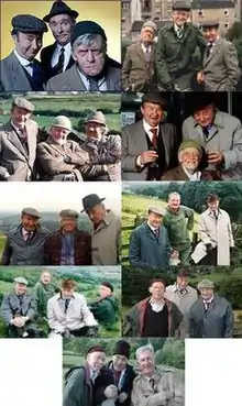 Although the show initially focused on the trio and four to five supporting characters, the cast expanded over the years to include an ensemble of eccentric characters who rounded out the show. The biggest expansion came in 1985 when four characters from the stage adaptation of the show were brought over to the series proper: Howard (Robert Fyfe), Pearl (Juliette Kaplan), Marina (Jean Fergusson), and Ivy's nephew, "Crusher" Milburn (Jonathan Linsley).[57] Further additions came the following year when the film Uncle of the Bride introduced Seymour's sister, Edie, played by veteran actress Thora Hird, and her family, who were brought over to the programme the following series.[58] The only addition with no professional acting experience was the Holmfirth resident Gordon Wharmby, who performed so well during his audition as mechanic Wesley Pegden, that Alan J. W. Bell cast him in one episode. Pegden would make two more appearances before being brought in permanently as Edie's husband and Seymour's brother-in-law after positive audience reception, becoming a regular character starting in Uncle of the Bride.[59][60][61] The increasingly large cast ensured a sense of continuity with the changing configuration of the trio, especially following the death of Bill Owen.[44]