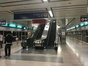 Lat Phrao station (Thai: สถานีลาดพร้าว, pronounced [sā.tʰǎː.nīː lâːt pʰráːw]) is a Bangkok MRT station on the Blue Line and Yellow Line located on Ratchadaphisek Road, near its intersection with Lat Phrao Road. It is the northern terminus of the Yellow Line. Although the station's name is Lat Phrao, it is located in Chatuchak district, not Lat Phrao district and Central Plaza Lat Phrao is nearer to Phahon Yothin station. Its symbol color is light blue.[1]