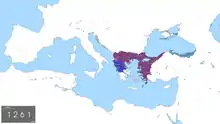 ![]() ![]() ![]() The Despotate of Epirus in dark blue, the Empire of Trebizond in light blue and the Principality of Theodoro in violet. | |||||||||||||||