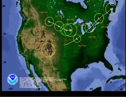 The massive system continued to trek to the east, as it began to push more into Canada, rather than the United States. An icing threat was also imminent as well. Some areas in Michigan recorded up to 0.5–0.75 inches (13–19 mm) of ice on March 24.[3] Part of Ontario were also impacted with significant freezing rain leading to significant ice accretion, the hardest hit area was that of Fergus, Ontario where there was roughly 1.4 inches (35 mm) of ice accretion. More ice accumulations were possible in New England, where freezing rain advisories were put into effect through March 25. The storm then started to rapidly weaken as it continued to move to the east, moved offshore late on March 25, then finally dissipated on March 26 while situated off Saint Pierre and Miquelon,[1] however, its remaining cold front lingered across the South while transitioning into a stationary front, which flared up thunderstorm activity for the Easter weekend.