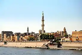 Esna (Arabic: إسنا IPA: [ˈʔesnæ], Ancient Egyptian: jwny.t or tꜣ-snt;[2][3] Coptic: ⲥⲛⲏ or ⲉⲥⲛⲏ Snē from tꜣ-snt;[4] Koinē Greek: Λατόπολις Latópolis[5] or πόλις Λάτων (Pólis Látōn)[6] or Λάττων (Lattōn);[7][8] Latin: Lato) is a city of Egypt. It is located on the west bank of the Nile some 55 km (34 mi) south of Luxor. The town was formerly part of the modern Qena Governorate, but as of 9 December 2009, it was incorporated into the new Luxor Governorate.