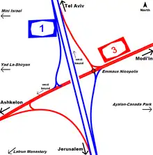 Latrun Interchange is a key road interchange of Israel, located in the Latrun Salient in the Israeli occupied West Bank. It lies on the route between Jerusalem and Tel Aviv, at the intersection of Highway 1 and Highway 3.