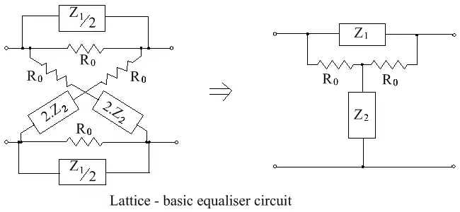A typical transmission path has increasing loss with frequency and this can be corrected by cascading the system with an equalizing network that has a rising response with frequency. In this regard, one circuit configuration that is commonly used to provide the necessary equalization is shown in the figure labelled 'Lattice - basic equaliser circuit', given earlier (in the section on 'Unbalanced Equivalents'). As stated there, the insertion loss of the normalized circuit is given by , so Z1 can be found from