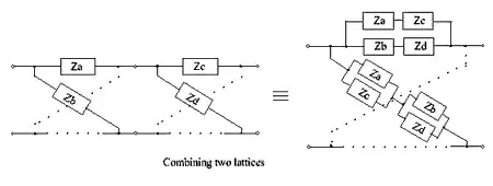 This conversion procedure starts by using the property of a lattice where a common series element in all arms can be taken outside the lattice as two series elements (as shown above). By repeatedly applying this property, components can be extracted from within the lattice structure. Finally, by means of Bartlett's bisection theorem,[15][16] an unbalanced bridged-T circuit is achieved.