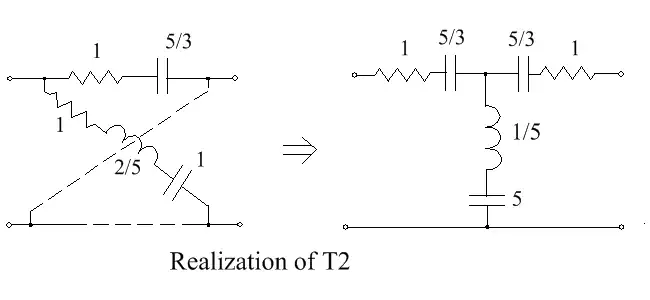 So Z1 can be realized as an R-C ladder network, in the Cauer manner,[21] and is shown as part of the bridged-T circuit below. Z2 is the dual of Z1, and so is an R-L circuit, as shown. The equivalent lattice circuit is shown on the right–hand side.