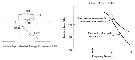 The figure below illustrates the issue: A lattice filter, equivalent to two sections of constant k low-pass filter, has been derived by image methods. (The network is normalised, with and so and The left-hand figure gives the lattice circuit and the right-hand figure gives the insertion loss with the network terminated (1) resistively, and (2) in its correct characteristic impedances.