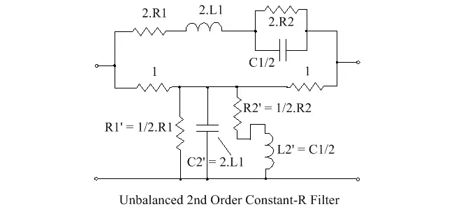 If an unbalanced circuit is required, we have to accept some overall loss. By choosing k1 = k2 = a = 0.5, then the network shown below is obtained. This circuit has an overall loss of four times, whereas the conventional L-C ladder network[1]:605 has no loss (but is not a constant resistance network).