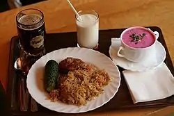 Latvian "Lido" lunch with cold beet soup, sauerkraut, cutlet, gherkin, kefir and kvass